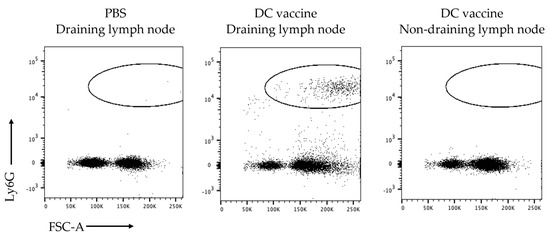 Ly6G+ cell recruitment was limited to the vaccine-draining lymph node. Dendritic cell (DC) vaccines were injected into one hind footpad of each female C57BL/6 mouse and phosphate-buffered saline (PBS) into the other hind footpad. Both popliteal lymph nodes were examined for Ly6G+ populations 12 h post-immunization, one representing the PBS-draining lymph node (left panel) and the other as a local vaccine-draining lymph node (middle panel). The inguinal lymph node on the vaccine-administered side of the mouse was also examined as a non-vaccine-draining lymph node (right panel). Representative flow cytometry dot plots of live cells in the lymph nodes are shown.