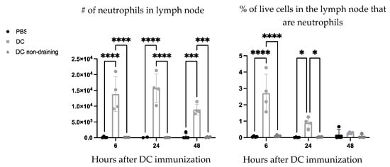 Neutrophils were recruited to the dendritic cell (DC) vaccine-draining lymph node. DC vaccines were generated ex vivo and administered into the hind footpads of female C57BL/6 mice (n = 2–4 per treatment). The vaccine-draining popliteal lymph nodes (labeled “DC”) were examined for neutrophils (Ly6G+ CD11b+) six-, 24-, and 48 h following DC vaccination and were compared with non-draining inguinal lymph nodes from the vaccinated side of mice (“DC non-draining”), and phosphate-buffered saline- draining lymph nodes (“PBS”). Statistical analysis was performed using a two-way analysis of variance; p-value < 0.05 (*), p-value < 0.001 (***), p-value < 0.0001 (****). Graphs show the means and the standard deviation with each dot representing an individual mouse.