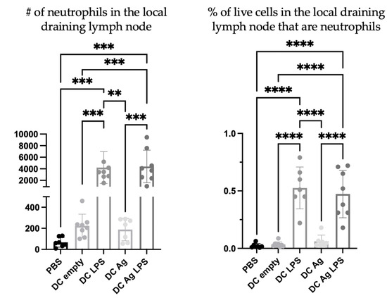 Neutrophil accumulation in the draining lymph nodes required maturation of dendritic cells (DCs). DC vaccines were prepared using DCs cultured ex vivo. The DCs were matured using lipopolysaccharide (LPS) as a source of pathogen-associated molecular pattern signaling that induces activation and maturation of DCs, and then they were loaded with antigens. DC cultures were prepared for immunization using different iterations of the manufacturing protocol. These included DCs stimulated with LPS only (DC LPS), DCs pulsed with antigens only (DC Ag), DCs pulsed with antigens and stimulated with LPS (DC Ag LPS), and DCs without LPS treatment or antigen-pulsing, which were termed “DC empty”. The number and percentage of neutrophils (Ly6G+ CD11b+) in the draining lymph nodes of the female C57BL/6 mice were examined one day following inoculations using flow cytometry. The data were analyzed for significance using a one-way analysis of variance; p-value < 0.005 (**), p-value < 0.001 (***), p-value < 0.0001 (****). Graphs show the means and the standard deviation with each dot representing an individual mouse.
