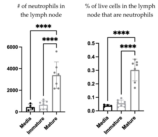 Soluble factor(s) produced by mature dendritic cells (DCs) were capable of recruiting neutrophils to the local draining lymph node. DCs were cultured ex vivo and half of the culture was matured using lipopolysaccharide, and the other half remained in an immature state. The DCs were plated in media and left overnight in an incubator at 37 °C. The supernatants of the immature and mature DCs were collected and injected into the hind footpads of female C57BL/6 mice (n = 4–7 per treatment), and media only was injected into negative control mice. Four hours post-injection, the draining lymph nodes were examined for neutrophils (Ly6G+ CD11b+). Significant differences were examined using a one-way analysis of variance; p-value > 0.0001 (****). Graphs show the means and the standard deviation with each dot representing an individual mouse.