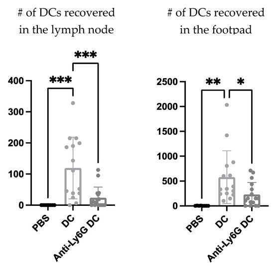 Neutrophils influenced dendritic cell (DC) vaccine recovery in the footpad and draining lymph node one day post-immunization. DC vaccines were prepared ex vivo and labelled with the fluorescent dye, carboxyfluorescein succinimidyl ester (CFSE). Female C57BL/6 mice (n = 8–16 per treatment) were treated with an anti-Ly6G antibody one day prior to and on the day of DC immunization to deplete neutrophils from the mice. The footpads and draining lymph nodes were examined for DC vaccine recovery at the injection site and at the draining lymph node one day following inoculation to evaluate the influence of neutrophils on the migratory capacities of the vaccine. The numbers of DCs in these tissues from mice that received anti-Ly6G and the DC vaccine were compared to mice that received the DC vaccine only, and negative control mice that received phosphate-buffered saline (PBS). Significant differences were determined using a one-way analysis of variance; p-value < 0.05 (*), p-value < 0.005 (**), p-value < 0.001 (***). Graphs show the means and the standard deviation with each dot representing an individual mouse.