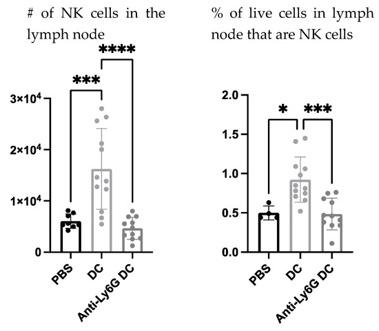 Neutrophils display heterogenicity and plasticity, which can be influenced by environmental stimuli [15,16,17]. As much as the immune system and its components are designed to be protective, there is also a capacity for harm. Neutrophils have been implicated in harmful immunological processes [18,19,20]. Like macrophages, neutrophils can display polarized phenotypes in the tumor microenvironment. These N1 and N2 cells demonstrate plasticity that can be influenced by external stimuli [21]. Thus, neutrophils can walk a fine line between being key players in immunological defenses while also having detrimental contributions to pathological conditions. This dual nature in contributions to both health and disease insinuates a potential to manipulate neutrophil phenotypes via immunotherapeutic tools to obtain desired outcomes. There has been limited research investigating the roles of neutrophils in DC-based vaccine immunobiology. However, DCs and neutrophils have established communications and crosstalk in various immunological contexts beyond DC-based vaccines [22,23,24,25]. The hypothesis tested here was that neutrophils are involved in the immune responses elicited by DC-based cancer vaccines. Using murine models, it was discovered that a population of neutrophils rapidly accumulated in vaccine-draining lymph nodes. Using antibody-mediated depletion, the potential roles of neutrophils in the migration of the DC-based vaccine and the concomitant activation of NK cell responses were examined.