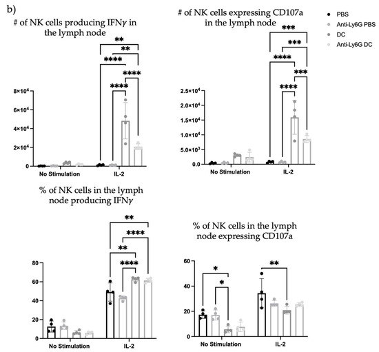 Neutrophils influenced the functionality of natural killer (NK) cells in local draining lymph nodes two days following dendritic cell (DC) immunization. Half of the female C57BL/6 mice received anti-Ly6G to deplete neutrophils the day before and the day of immunizations, and then DC vaccines or phosphate-buffered saline (PBS) were administered (n = 4 per treatment) into hind food pads. (a) Two days later, the number and proportion of NK cells in the draining popliteal lymph nodes were compared between neutrophil-depleted and non-depleted mice. (b) NK cells were stimulated using IL-2, and the production of IFN (left panels) and CD107a (right panels) were measured using flow cytometry. A two-way analysis of variance was used to assess statistical significance; p-value < 0.05 (*), p-value < 0.005 (**), p-value < 0.001 (***), p-value < 0.0001 (****). Graphs show the means and the standard deviation with each dot representing an individual mouse.