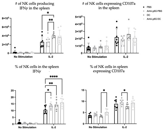 Influence of neutrophils on natural killer (NK) cell responses in the spleen one-week post-dendritic cell (DC) vaccination. Anti-Ly6G was given to half of the female C57BL/6 mice to deplete neutrophils (n = 8 per treatment). DC vaccines generated ex vivo were administered. Controls received phosphate-buffered saline (PBS). One week later, NK cell responses in the spleens were assessed. Splenocytes were stimulated with interleukin (IL)-2, and NK cell degranulation based on expression of CD107a and production of IFN were measured using flow cytometry. A two-way analysis of variance was used to evaluate statistical significance; p-value < 0.05 (*), p-value < 0.005 (**), p-value < 0.0001 (****). Graphs show the means and the standard deviation with each dot representing an individual mouse.