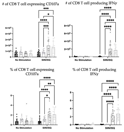 In some experiments, assessments of cytokine expression were conducted. Following surface antibody and FVD staining, cells were fixed by incubating with a permeabilization and fixation buffer (BioLegend Cat#420801) for 10 min. Cells were washed twice with permwash buffer (BioLegend Cat#421002) and then resuspended in a mastermix of cytokine-detecting antibodies containing anti-TNF-α (BioLegend Cat#506308) and anti-IFN (BioLegend Cat#505808) and incubated for 20 min at 4 °C. Cells were washed twice in permwash buffer and resuspended in FACS buffer to be run through the BD FACSCantoTM II flow cytometer and analyzed using FlowJo software v10 (Ashland, OR, USA).