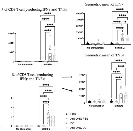 Additionally, due to the importance of T cell education in DC vaccination platforms, the influence of neutrophils on the DC vaccine education of CD8+ T cell responses was evaluated. Ovalbumin was used as a well-characterized model antigen. Splenic antigen-specific CD8+ T cell responses of the DC-immunized group, and the neutrophil-depleted immunized group was significantly higher than both the PBS-treated and neutrophil-depleted PBS-treated control groups (Figure 11). This demonstrated that DC-based immunization could educate CD8+ T cell responses. However, there were little to no differences between the DC-immunized group and the DC-immunized mice that had neutrophils depleted. The only exception was that the most functional, multi-cytokine-producing T cells had slightly more IFN per cell. Therefore, neutrophils did not seem to have any substantial biological effect on the ability of DCs to induce CD8+ T cell responses, as per the indicators that were assessed in this study.