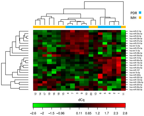 To identify biologically relevant miRNA expression changes between patients with PDR and the control group, the standard approach was employed using a t-test and a cut-off of p-value < 0.05 as the primary criterion followed by Benjamini–Hochberg correction for false positive errors at a significance level of 0.05.