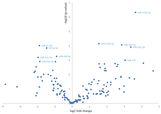 Volcano plot demonstrating the relationship between the p-values and the fold change of miRNA expression (dCq) between PDR and the control group. The labels indicate the ten most differentially expressed miRNAs.