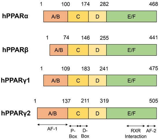 PPARs comprise three subtypes that have a high degree of homology: PPARα, PPARβ/δ and PPARγ. The PPARs contain a modular structure consisting of an amino-terminal ligand-independent transcriptional activation A/B domain, a 70 amino acid-long DNA-binding C domain, a hinge D domain, and a carboxyl-terminal ligand-binding E/F domain composition (Figure 1) [9,10].The sequence structure of the C and E/F domains of PPARs subtypes has high homology [5].