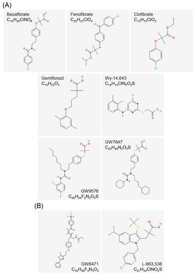 The most classic agonists of PPARα are fibrates, including bezafibrate, fenofibrate, clofibrate, gemfibrozil, and Wy-14,643 [49]. Wy-14,643, a pirinixic acid first discovered to play an effective role in anti-hypercholesterolemia [50], induces marked hepatomegaly and peroxisome proliferation in hepatocytes and reduces serum cholesterol and triglyceride levels in male mice [51]. Subsequent reports confirmed that Wy-14,643 is a specific activator of PPARα [52]. The Wy-14,643-activated PPARα regulates yes-associated protein (YAP) expression and nuclear translocation, and blockade of YAP signaling abolishes PPARα-induced hepatocyte hypertrophy and hepatocyte proliferation in mice [53]. GW9578, a urea-substituted thioisobutyric acid (TiBA), is a potent murine PPARα-selective agonist, but it has only a 20-fold selectivity for human PPARα [54]. Furthermore, GW9578 exists in the form of a viscous oil or foam, which provides a hindrance to the quantitative treatment of experiments in vitro and in vivo. Brown et al. identified GW7647 through solid-phase array synthesis to aid in identifying PPARα agonists with high selectivity and good physical properties [55]. As a thioisobutyric acid derivative, GW7647 is the first identified PPARα-specific agonist. It has a 200-fold higher specificity than PPARβ/δ and PPARγ and has lipid-lowering activity in vivo. The GW7647 is an excellent PPARα-specific agonist that could be used in experimental research since it is a powder with a melting point of 153–154 °C [28].