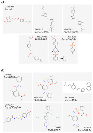The PPARs require ligand activation, such as natural and synthetic ligands, which is a characteristic of many other steroid hormone receptors [4,23,24]. The natural ligands consist of a group of endogenously secreted molecules, including various unsaturated fatty acids and their metabolic products. The specificity and activity of these molecules are not high in most circumstances. Additionally, the incubation of triglyceride-rich lipoproteins with lipoprotein lipase (LPL) produces many ligands for PPARs [25,26]. Certain prostaglandins and their metabolic derivatives are also natural ligands [27]. The structure and geometry of PPARβ/δ and PPARα are similar, while PPARγ more likely to bind long-chain polyunsaturated fatty acids [28]. At present, a variety of synthetic ligands are active on the market. These synthetic ligands often have higher PPAR subtype specificity and stronger metabolic activity than natural ligands. The synthetic ligands include agonists and antagonists (Table 1). The antagonists are also referred to as “inverse agonists” because, although they bind to the agonist binding sites of PPARs, they cause opposite pharmacological responses by stabilizing the binding state of uncoordinated PPARs and multicomponent co-repressors in order to inhibit transcriptions of downstream target genes [29,30]. Physical changes caused by ligand binding include changes in the three-dimensional structure [31,32], dissociation of heat shock proteins and chaperones [33,34], and nuclear entry [35,36] of PPARs.