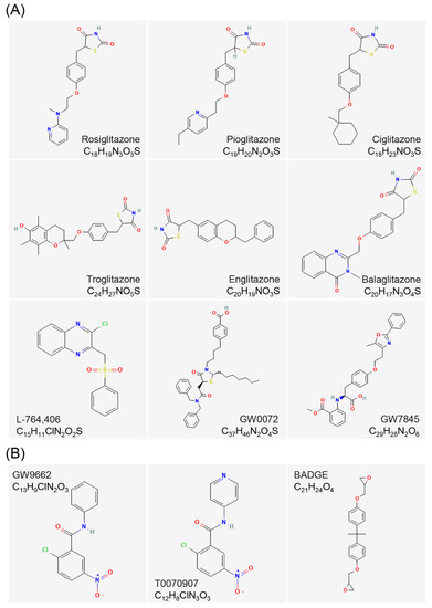 | PPARγ | TZDs | rosiglitazone (RGZ) [75] | GW9662 [80,81] |