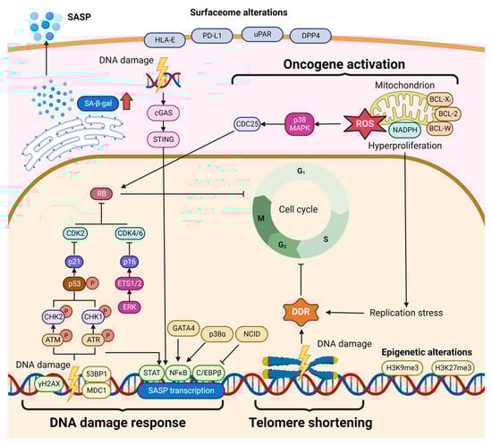 Pathways in senescence induction. DNA-damaging irradiation and chemotherapy, oncogene activation, tumor-suppressor inactivation, oxidative stress and telomere shortening cause DNA damage and activate the DNA damage response (DDR) pathway, which ultimately triggers cellular senescence. DNA double-strain or single-strain breaks activate ataxia telangiectasia-mutated (ATM)/ATM and Rad3-related (ATR) signaling, leading to p53 and p21CIP1 activation. In parallel, p16INK4a can also be activated by the ERK/ETS1/2 pathway. Consequently, p21CIP1 inhibiting cyclin-dependent kinase 2 (CDK2) and p16INK4a inhibiting CDK4/6 derepress the retinoblastoma (Rb) tumor suppressor, which ultimately retards cells to enter S phase from G1 phase, causing cell-cycle arrest. Moreover, oncogene activation can cause the accumulation of Rb via the p38/mitogen-activated protein kinase (MAPK)/cell division cycle 25 (CDC25) pathway that is activated by massive reactive oxygen species (ROS) in mitochondria. Simultaneously, unsolvable DDR activates the Rb and p53 pathways, and promotes the formation of promyelocytic leukemia nuclear bodies, which ultimately leads to senescence-associated heterochromatin foci (SAHF) through the ASF1A and HIRA chaperones. Furthermore, cytosolic DNA triggers the cyclic GMP-AMP synthase (cGAS)/signaling effector stimulator of interferon genes (STING) DNA sensing pathway, together with the activated DDR pathway, activates several transcription factors including STAT (signal transducer and activator of transcription), NF-kB (nuclear factor ‘kappa-light-chain-enhancer’ of activated B-cells) and C/EBPβ (CCAAT/enhancer binding protein β). These transcription factors regulate a series of target genes coding various senescence-associated proteins, which are secreted to the ultra-space of senescent cells, known as senescence-associated secretory phenotype (SASP). Overall, these senescence-related pathways are interdependent and form a complex regulatory network, contributing to several senescence phenotypes, including p21 and p16 upregulation, stable cell-cycle arrest, β-galactosidase (β-gal) accumulation, SASP production, apoptosis resistance (upregulation of anti-apoptosis proteins: Bcl-XL, Bcl-2 and Bcl-W), epigenetic alteration (tri-methylation at the 9th or 27th lysine residue of the histone H3 protein: H3K9me3 and H3K27me3) and surfaceome changes (upregulation of HLA-E, PD-L1, uPAR, and DPP4).