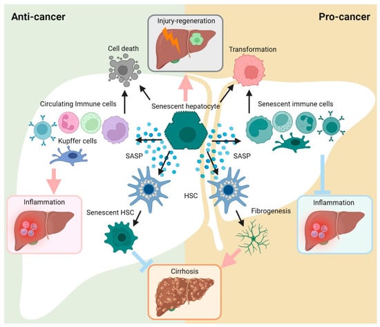 To sum up, both SASP-induced HSC activation and cellular senescence within HSCs take an active part in hepatocarcinogenesis. Overall, HSC-associated senescence may be regarded as a protector against liver fibrosis and HCC. On the other hand, senescent HSCs can also fuel the tumor environment through multiple SASP factors. Controversial findings address many previous questions, but also bring more.