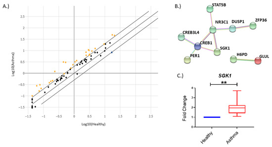 The glucocorticoid signaling pathway is altered in asthma. (A) Scatter plot showing distribution of up- and downregulated genes. (B) High-confidence (0.7) STRING network [20] of connected upregulated genes in individuals with asthma. (C) SGK1 is significantly increased in PBMCs from individuals with asthma (n = 17). Shown as fold change from healthy individuals (n = 4), normalized to 1. ** = p < 0.01.
