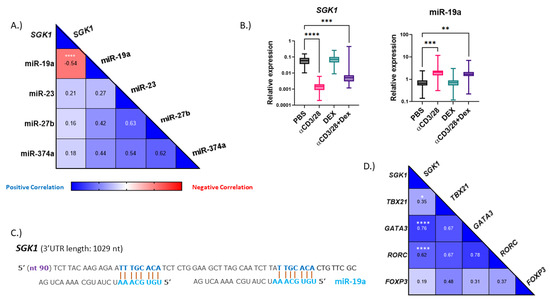 miRNAs are involved in numerous processes and act as master regulators in asthma pathogenesis [7]. To determine if miRNAs may be responsible for regulating the expression of SGK1, we searched for potential binding sites using miRNet, a comprehensive database that integrates findings from multiple databases [21]. We chose candidates to examine based on miRNet prediction and those previously reported to be associated with asthma or the glucocorticoid signaling pathway [10,16,22]. We found that miR-19a negatively correlated to SGK1 in total treated PBMCs and displayed opposite expression patterns (Figure 2A,B). miR-19a was previously identified to be altered in airway cells in individuals with asthma [15,23,24]. When examining potential binding sites, we found that SGK1 contains two conserved binding sites for miR-19a in the 3′UTR (Figure 2C). Moreover, when T cell transcription factors were examined in the same treated PBMCs, we found strong positive correlations to GATA3 and RORC (Figure 2D). Together, these findings suggest that miR-19a may regulate SGK1 in TH cells.