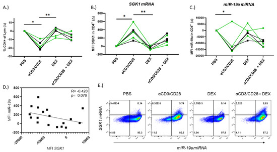 Furthermore, the expression of SGK1 and miR-19a was visualized in CD4+ T cells that were sorted and stained using the PrimeFlow protocol. As in the PrimeFlow RNA assay, we observed increased expression of SGK1 mRNA under αCD3/αCD28 stimulation and the combined conditions compared to Dex treatment (Figure 4 and Figure S3A). As in flow cytometry, nearly every cell expressed miR-19a (red), but not every cell expressed SGK1 (green) (Figure 3E and Figure S4B,C).