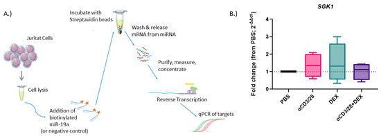 miR-19a directly binds SGK1. Biotinylated miR-19a was used to directly pull out SGK1 from Jurkat cell lysates. (A) Graphical representation of the pulldown protocol. (B) SGK1 mRNA binding was examined after pulldown by miR-19a. Results are shown as fold change from PBS (2−ΔΔCT); αCD3αCD28 (αCD3/28), dexamethasone (DEX), αCD3αCD28 and dexamethasone (αCD3/28 + DEX) or media alone (PBS vehicle).