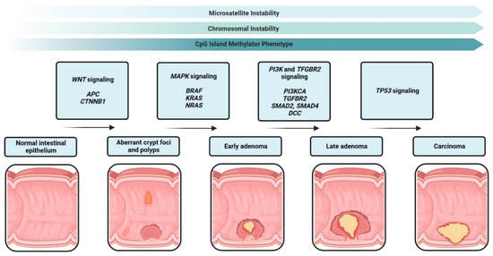 Adenoma-carcinoma sequence from healthy epithelium to carcinoma in situ. Carcinogenesis progresses through the accumulation of several mutations in oncogenes such as BRAF, KRAS or HRAS and tumor suppressor genes such as APC, SMAD2 or TP53.