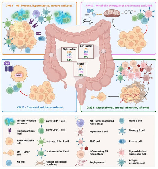 We want to mention that a recent study analyzing single cell transcriptomes from 63 patients with a focus on epithelial cells and fibrosis identified two epithelial tumor states and refined the CMS classification. The two distinct epithelial subtypes corresponding to the CMS classification were intrinsic (i) CMS2 and iCMS3. Most CMS2 and CMS3 tumors contained iCMS2 and iCMS3 epithelial cells. MSI-H and CMS1 cancers were classified iCMS3. MSS tumors with iCMS3 epithelium (iCMS3_MSS) had features that were more similar to MSI-H than to iCMS2_MSS cancers. The fibrotic CMS4 group comprised two epithelial subtypes. Five functional subtypes of CRC were defined, based on epithelial type, microsatellite status and presence of fibrosis [32]. This new refined classification lays the focus on epithelial cells and fibrosis. However, cells of the TME and not epithelial cells are the main producers of cytokines. Thus, the TME influence is better described by the “established” CMS classification outlined in Figure 2.
