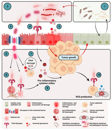 Chronic inflammation seems to boost tumor growth and enhance early tumorigenesis in organs that have contact with microbial products or directly with microbiota [71]. As an example, Helicobacter pylori infection is known to induce chronic inflammation that often leads to gastric cancer [72,73]. In colorectal cancer, the bacterial strains Chlostridioides difficile and its toxin TcdB promote colonic carcinogenesis in a germ-free mouse model of colorectal cancer [74]. The tumor promoting ability of some bacteria is mediated by inflammatory cells of the tumor microenvironment and the cytokines these cells produce [75]. Long-term reduction or prevention of chronic inflammation by aspirin or other nonsteroidal anti-inflammatory drugs reduces CRC incidence and mortality [76], highlighting the importance of inflammatory cytokines.