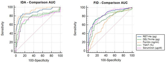 | Ferritin RET-He TSAT Delta-He Serum Iron | 0.920 0.892 0.791 0.752 0.737 | RET-He Serum iron Delta-He TSAT Ferritin | 0.847 0.835 0.808 0.754 0.678 |