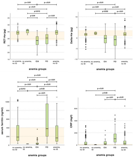 - Weimann, A.; Cremer, M.; Hernáiz-Driever, P.; Zimmermann, M. Delta-He, Ret-He and a New Diagnostic Plot for Differential Diagnosis and Therapy Monitoring of Patients Suffering from Various Disease-Specific Types of Anemia. Clin. Lab. 2016, 62, 667–677. [Google Scholar] [CrossRef]