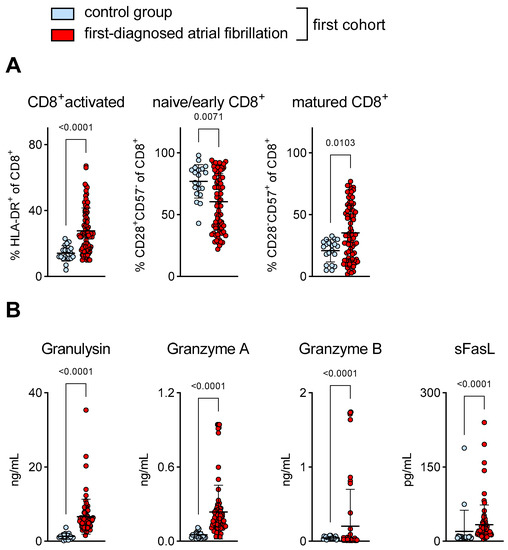 Activation of CD8+ T cells in patients with first-diagnosed AF. (A) Phenotyping of circulating CD8+ T cells (flow cytometry). Activated cytotoxic T cells (HLA-DR+), naive/early differentiated CD8+ T cells (CD28+CD57−) and matured CD8+ T cells (CD28−CD57+). (B) Increased plasma levels of cytotoxic effector molecules associated with CD8+ T cell function (ELISA). Results are expressed as single values (n = 20/80), mean with SD.