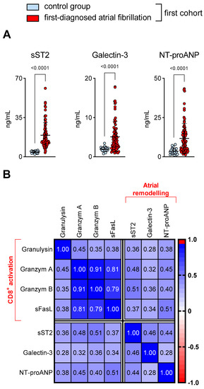 Activation of CD8+ T cells corresponds to biomarkers of cardiac fibrosis and atrial dysfunction in patients with first-diagnosed AF. (A) Increased plasma levels of biomarkers that suggest cardiac fibrosis (sST2, galectin-3) and atrial dysfunction (NT-proANP) (ELISA). Results are expressed as single values (n = 20/80), mean with SD. (B) Correlation matrix comparing CD8+ T cell effector molecules (granulysin, granzymes, sFasL) with sT2, galectin-3 and NT-proANP plasma levels in patients with first-diagnosed AF (n = 80). Pearson correlation coefficients (+1 positive, −1 negative correlation) are shown.