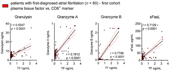 Endothelial and subendothelial TF initiates the coagulation cascade that maintains a pre- and pro-thrombotic state and promotes pro-inflammatory PAR signalling [25,42]. This has already been shown in the early stages of arrhythmia [43,44,45,46]. The next immediate question for consideration is the following: Is the TF pathway linked to the observed pro-inflammatory and cytotoxic activity in patients with FDAF? In our study, we demonstrated that elevated levels of circulating TF associated with biomarkers are indicative of an increase in CD8+ T cell activation (Figure 3).