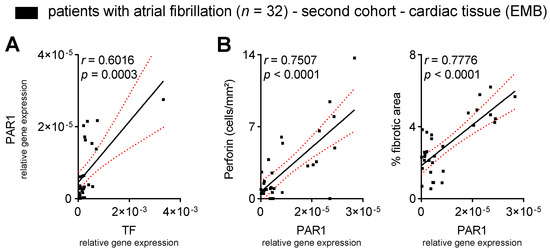 Cardiac PAR1 expression correlates with markers of thrombo-inflammation in patients with AF. Patients underwent transvascular right-ventricular endomyocardial biopsy (EMB). PAR1 gene expression in EMBs: (A) relative to TF gene expression; (B) relative to the distribution of perforin-positive cytotoxic T cells and the extent of cardiac fibrosis. Results are expressed as single values (n = 32), Pearson correlation coefficients and linear regression lines with 95% CI.