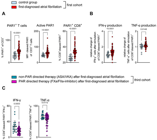 CD8+ T cell-mediated effector function in early AF is linked to PAR1 activation. (A,B) Patients with first-diagnosed AF vs. control group. (A) Phenotyping via flow cytometry of T cells in patients with first-diagnosed AF revealed a higher percentage of circulating cells that possess PAR1 (CD3+PAR1+), an increased expression of thrombin-activated PAR1 (as expressed by an increased mean fluorescence intensity (MFI) of thrombin-cleaved PAR1) and a higher percentage of cytotoxic T cells that express PAR1, which was activated by thrombin (CD8+ cleaved PAR1+). (B) Enhanced pro-inflammatory effector function of thrombin-activated CD8+PAR1+ T cells as expressed by staining for IFN-γ and TNF-α. (C) Separate cohort of patients (third cohort) on stable anti-thrombotic therapy. Lower percentage of circulating pro-inflammatory thrombin-activated CD8+PAR1+ T cells under a PAR-directed therapy (FXa/FIIa-inhibitor) when compared to non-PAR-directed therapy (ASA/VKA). Results are expressed as single values (A,B n = 20/80; C n = 20/60), mean with SD.