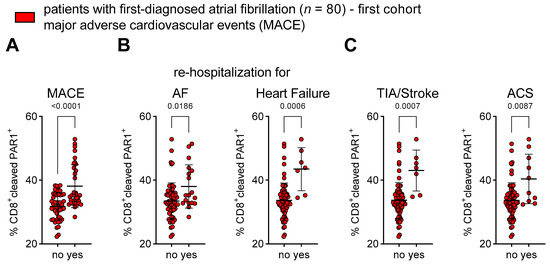 Frequency of thrombin-activated CD8+PAR1+ T cells is associated with adverse outcomes in patients with first diagnosis of AF. Patients were stratified into two groups according to the occurrence of MACEs (no vs. yes) during follow-up after their first diagnosis of AF. (A) Composite endpoint MACE: first occurrence of cardiovascular death, unplanned re-hospitalisation for AF, un-planned hospitalisation for heart failure (HF), transient ischaemic attack (TIA), ischaemic stroke, acute coronary syndrome (ACS), deep vein thrombosis, peripheral thromboembolism. (B,C) Adverse outcome events that are associated with the disease progression of AF (B) (un-planned re-hospitalisation for AF, un-planned hospitalisation for HF) and thrombo-embolic and atherothrombotic complications (C) (TIA, ischaemic stroke, ACS) are related to CD8+PAR1+ T cells at the time of first diagnosis of AF. Results are expressed as single values (n = 80), mean with SD.