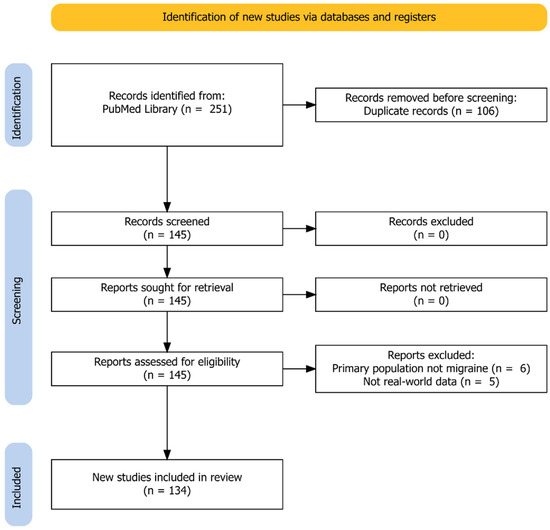 Our selection criteria were language (English), primary headache type (migraine and migraine-related disorders), and study design (real-world data). The last search took place on 1 December 2022.