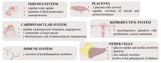 Apelin is an important hormone that regulates metabolism (Figure 2). It lowers the concentration of glucose in the serum, increasing its uptake and absorption by muscle cells and adipocytes. It also increases the sensitivity of cells to insulin [18]. Interestingly, insulin stimulates the secretion of apelin by adipose tissue cells, while apelin inhibits insulin secretion [19,29]. Because apelin stimulates glucose transport and acts additively to insulin, it is considered an important metabolic hormone that is also involved in the pathogenesis of insulin resistance and diabetes. Many studies have shown an increased concentration of apelin in patients suffering from both type I and type II diabetes. Krist et al. suggested that it could be a compensatory mechanism devoted directly to reducing insulin resistance as apelin itself exerts a different metabolic effect [30]. Studies on isolated murine adipocytes and the 3T3L1 line also indicated that apelin influences lipid metabolism and has an inhibitory effect on lipolysis [31]. Numerous reports show a significant impact of this hormone on the functioning of the cardiovascular system acting as a mitogenic, chemotactic, and anti-apoptotic agent for endothelial cells including in Xenopus embryos [32]. In addition, it lowers blood pressure, increases the contractility of the heart muscle and reduces the risk of atherosclerosis, and thus relieves the symptoms of hypertension [33]. Apelin is also an angiogenic factor in mice and humans; it stimulates the maturation and stabilization of vascular cells in physiological angiogenesis [34], as well as during neoangiogenesis [35], mainly by the induction of proliferation and migration. Additionally, it participates in the neoplastic progression of ovarian cancer cells [36] and the invasive growth of lymphatic microvessels in vivo, which, in the future, may lead to novel anti-cancer therapies targeting lymphangiogenesis [37]. Apelin can also regulate inflammation; hence, it is sometimes classified as a cytokine. In rats, it has the potential to inhibit the secretion of pro-inflammatory mediators, protecting tissues from excessive inflammatory responses [38]. The beneficial effect of apelin also manifests itself in inhibiting the secretion of free radicals in adipose tissue [39]. There is evidence that apelin plays a role in regulating hypothalamic water uptake, thereby contributing to the maintenance of fluid homeostasis [40]. Apelin is also an important regulator of reproductive functions. It influences steroidogenesis in ovarian cells by stimulating the secretion of progesterone and estradiol by increasing the expression of the enzymes 3β hydroxysteroid dehydrogenase and aromatase in humans, pigs, and cattle [41,42,43].