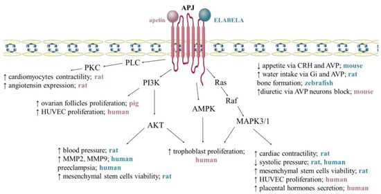 ELABELA can act via APJ and induces different downstream signalling pathways, such as PI3K/AKT/mammalian target of rapamycin kinase (mTOR) [45] and mitogen-activated protein kinase 3 (MAPK3/1) [46], and participates in the regulation of various processes including embryo development, heart, and renal function, food intake, and placenta function (Figure 2). For example, ELABELA-32 increases cardiac contractility in rats and induces coronary vasodilation via MAPK3/1 [47], interestingly being more efficient than apelin [48]. Moreover, via the activation of APJ, ELABELA-32 attenuates the increase in right ventricular systolic pressure, ventricular hypertrophy, and pulmonary vascular remodeling in cardiopulmonary tissues from PAH rat models and patients via the MAPK3/1 pathway [26], while in mice, it exerts a vasodilatory effect on the coronary artery by inhibiting the potentiation of Ang II-induced vasopressor [46]. On the other hand, ELABELA-21 in the paraventricular nucleus leads to elevated blood pressure in rats, and finally hypertension via activation of the PI3K/AKT pathway [49], which indicates an isoform-dependent effect. Interestingly, some studies have suggested an effect of ELABELA-32 on preeclampsia during pregnancy, which is characterised by hypertension, because ELABELA-32 induces the upregulation of matrix metalloproteinase-2 and matrix metallopeptidase-9 (MMP9) expression due to the activation of PI3K/AKT/mTOR, which is strictly connected with invasion and migration associated with early-onset preeclampsia pathogenesis in human HTR8/SVneo cells [46]. Another interesting property of ELABELA is the regulation of food intake, for instance, by suppressing appetite regulation in mice via activation of corticoliberin and arginine vasopressin (AVP) neurons in the hypothalamus [13,50]. Similarly, in adult rats, ELABELA-32 regulates fluid homeostasis by increasing diuresis and water intake by inhibiting vasopressin [46], which is regulated by activation of Gi signalling or AVP [50]. Finally, ELABELA/APJ regulates zebrafish skeletal development, bone formation, and bone homeostasis by inhibiting SRY-box transcription factor 32 levels in ventrolateral endodermal cells, indirectly leading to changes in the expression of bone morphogenetic protein targets [51].
