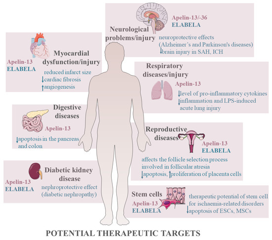 In summary, expression of apelinergic system was described in many tissues indicating the involvement in numerous physiological and pathological processes; both apelin and ELABELA at different doses and in various cells regulate apoptosis by activating several kinases such as the PI3K/AKT and ERK1/2 signalling pathways, changing the expression of genes and proteins that mediate apoptosis. Depending on the species/animal model, apelin may have anti-apoptotic effects on the granulosa cells in rats [43], with pro-apoptotic effects in bovine [108]. Depending on the type of cells and doses used, apelin shows different effects, which is the basis for the contradictory data in the literature. Nevertheless, apelin mainly shows anti-apoptotic activity, which is an introduction to research and a potential therapeutic target for various cancers [3,4] but also for many dysfunctions and diseases of the neurological, cardiovascular, and urinary systems (Figure 4).