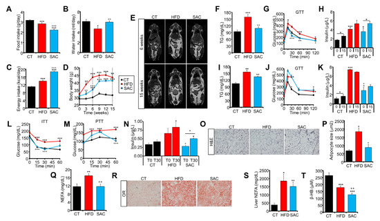To separate the effects of obesity and hepatic steatosis on metabolism, we fed C57BL/6J male mice with either a high-fat diet (HFD, 45% fat) or with standard chow and drinking water supplemented with 50% sucrose (SAC). Mice fed with standard chow and water were used as the control (CT). HFD mice ate less solid food and drank less water than CT mice (Figure 1A,B). However, due to the higher density of the food, the calories ingested were higher, and HFD mice rapidly gained more weight than the other groups (Figure 1C,D). In contrast, SAC mice ate less solid food than the other groups but drank the same amount of water as CT mice (Figure 1A,B), resulting in a higher caloric intake due to sucrose ingestion (Figure 1C). Interestingly, SAC mice gained weight more slowly than HFD mice, but by week 15, both groups were indistinguishable (Figure 1D). The visualization of fat distribution by MRI confirmed that HFD mice had larger fat depots after 6 weeks of the diet (Figure 1E, Supplementary Figure S1B), but after 15 weeks, HFD and SAC mice showed similar adiposity (Figure 1E, Supplementary Figure S1C). Moreover, after 6 weeks, HFD mice had higher blood triglycerides (TG) and impaired glucose tolerance, even though they were hyperinsulinemic (Figure 1F–H). Although, at this point, SAC mice had normal glucose tolerance, they were also hyperinsulinemic, suggesting insulin resistance (Figure 1G,H), which was further supported by similar homeostatic model assessment-insulin resistance (HOMA-IR) levels as HFD mice (Supplementary Figure S1D). Surprisingly, most of the differences between HFD and SAC mice were lost after 15 weeks, with both groups then showing increased blood TG and glucose intolerance (Figure 1I,J), although HFD mice were even more hyperinsulinemic (Figure 1K).