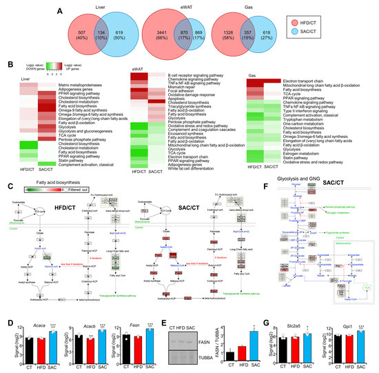 HFD and SAC induce distinct gene expression profiles in eWAT and liver. (A) Comparison of DEGs in HFD/CT and SAC/CT for each tissue analyzed using microarray hybridization. (B) Enrichment analysis showing the log (p value) of pathways associated with upregulated (red) or downregulated genes (green) in the same tissues of HFD and SAC mice. (C–E): The fatty acid biosynthesis pathway is associated with downregulated genes in HFD mice and with upregulated genes in SAC mice (C), including FASN, as determined by mRNA (D) and protein levels (E). (F,G): The glycolysis and gluconeogenesis (GNG) pathway is associated with upregulated genes only in SAC mice (F) including fructose handling genes such as Slc2a5 (G). n = 4/group (A–D,G) and n = 3/group (E). * p < 0.05, and *** p < 0.005 with respect to the CT group. + p < 0.05, and +++ p < 0.005 with respect to the HFD group. Gas = gastrocnemius.