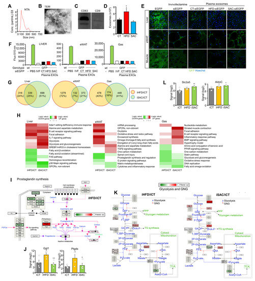 Injection of HFD and SAC plasma exosomes reproduce transcriptomic changes observed in donor mice. (A–D): Plasma exosomes from donor mice were characterized by NTA (A), TEM (B), Western blotting of membrane markers CD63 and CD9 (C), and exosome number (D). (E,F): Biodistribution of plasma exosomes from CT, HFD, and SAC mice was followed by transfecting them with a siRNA against EGFP and IV injection into EGFP transgenic mice. Injection of the same siEGFP associated with Invivofectamine was used as a positive control. Loss of fluorescence was determined using confocal microscopy of the tissues of interest (E) and luminometer analysis of tissue lysates (F). (G) Comparison of DEGs in mice injected with HFD plasma exosomes (iHFD) or SAC exosomes (iSAC) with those injected with CT exosomes (iCT) for each tissue analyzed using microarray hybridization. (H) Enrichment analysis showing log (p value) of pathways associated with upregulated (red) or downregulated genes (green) in the same tissues of iHFD and iSAC mice. (I,J): Inflammation is increased in the eWAT of iHFD mice, with decreased prostaglandin synthesis (I) and increased eicosanoid synthesis genes (J). (K,L): The glycolysis and GNG pathway is increased in the liver of iSAC mice (K), particularly those genes involved in fructose handling (L). n = 3/group (A–F) and n = 4/group (G–L). * p < 0.05, and ** p < 0.01 with respect to the iCT group. + p < 0.05, and ++ p < 0.01 with respect to the iHFD group. Scale bar in (E) represents 50 µm. EGFP = enhanced green fluorescent protein; IVF = invivofectamine; NTA = nanoparticle tracking analysis; TEM = transmission electron microscopy.