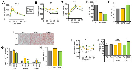 Injection of HFD and SAC plasma exosomes reproduce the metabolic phenotype observed in donor mice. (A,B): iHFD but not iSAC show glucose intolerance (A) and insulin resistance (B). (C,D): Both experimental groups show increase glucose output during a PTT (C), and lower circulating β-HB levels (D). (E) Only iSAC mice have increased alanine transaminase (ALT) activity. (F) Both experimental groups display hepatic steatosis. (G,H): Only iHFD mice show significant enlargement of adipose depots (G) and elevated circulating NEFA levels (H). (I,J): Oral administration of fructose increased glycemia (I) and circulating TG (J) only in iSAC mice. n = 4/group (A–J). * p < 0.05, ** p < 0.01, and *** p < 0.005 with respect to the iCT group. + p < 0.05, ++ p < 0.01, and +++ p < 0.005 with respect to the iHFD group. NS = not significant.