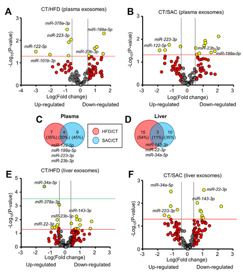 The miRNA profile differs between HFD and SAC plasma and liver exosomes. (A,B): Volcano plots show differential miRNA expression of plasma exosomes from HFD (A) and SAC mice (B) compared with CT mice. (C,D): Comparison of the differentially expressed exosomal miRNAs in HFD/CT and SAC/CT in plasma (C) and liver (D). (E,F): Volcano plots show differential miRNA expression of liver exosomes from HFD (E) and SAC mice (F). n = 3/group (A–C) and n = 4/group (D–F).