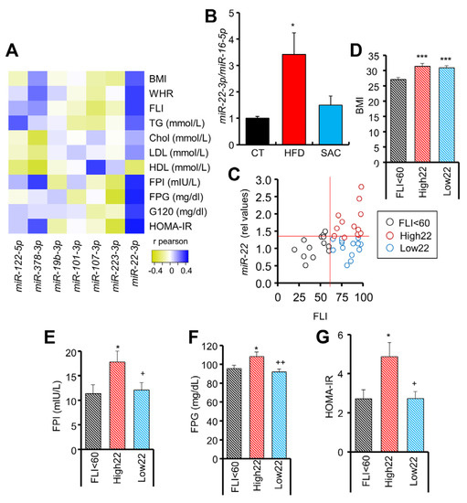 Circulating miR-22-3p can be used as a biomarker for MAFLD stratification. (A) Heatmap showing positive (blue) or negative (yellow) correlation coefficient values between circulating miRNAs and clinical parameters in a human cohort. (B) Circulating miR-22-3p levels are increased in mice after 15 weeks of a HFD but not a SAC diet. (C) Correlation between circulating miR-22-3p and fatty liver index (FLI) in humans. (D–G): Individuals with FLI > 60 and high miR-22-3p levels (High22) show equivalent body mass index (BMI) (D) but increased fasting plasma insulin (FPI) (E), fasting plasma glucose (FPG) (F), and homeostatic model assessment-insulin resistance (HOMA-IR) (G) than those with FLI > 60, but low miR-22-3p levels (Low22). n = 40 (A,C–G), n = 3/group (B). * p < 0.05 and *** p < 0.005 with respect to CT or FLI < 60 group. + p < 0.05 and ++ p < 0.01 with respect to High22 group. chol = cholesterol; G120 = glucose at 120 min during oral GTT; HDL = high density lipoprotein; LDL = low density lipoprotein; WHR = waist/hip ratio.