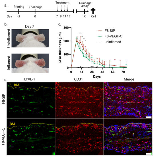 All animal experiments were performed in accordance with animal protocols (ZH212/19) approved by the local veterinary authorities (Kantonales Veterinäramt Zürich, Zurich, Switzerland). Female hemizygous K14-VEGF-A transgenic mice were bred at the ETH Zurich rodent facility under specific pathogen-free conditions. At least 5 mice per group aged between 8–10 weeks were subjected to topical sensitization with 2% oxazolone (Sigma-Aldrich, St. Louis, MI, USA) in 4:1 acetone: olive oil on their shaved abdomen (50 μL) and on each paw (5 μL). On the 5th day after sensitization, mice were topically challenged with 1% oxazolone (Sigma-Aldrich) in 4:1 acetone: olive oil on both sides of both ears (10 μL). Ear thickness was periodically monitored with a caliper. Starting on day 7 post-challenge, mice were treated intravenously with either F8-VEGF-C or F8-SIP (50 μg resp. 2.5 mg/kg body weight) every other day until day 13 (four treatments in total). Mice were euthanized after the inflammation had resolved.