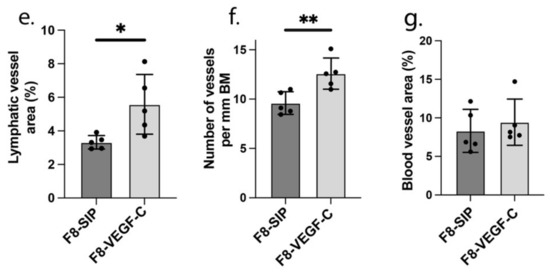 We induced inflammation in the ear skin of hemizygous K14-VEGF-A transgenic mice using a hapten (oxazolone)-driven CHS model [6,19]. Then, we treated these mice intravenously every second day starting on day 7 until day 15 post-challenge with either a non-functional control protein (F8-SIP) [13] or the therapeutic protein (F8-VEGF-C) delivering VEGF-C to the EDA-domain of fibronectin [6]. We followed the course of the inflammatory response by measuring ear thickness until resolution (Figure 1a–c). Targeted VEGF-C delivery significantly reduced ear skin edema by day 13 post-challenge (day 6 after the start of the treatment) compared to the control protein. Ear edema resolved completely in F8-VEGF-C-treated mice by day 59 post-challenge, while it remained elevated for a longer time period and resolved only by day 74 in F8-SIP control-treated mice (Figure 1c). Previously, we have shown that F8-VEGF-C induces local expansion of the lymphatic vasculature by day 8 after the start of the treatment [6]. To investigate whether this expansion persisted even after inflammation had resolved, we performed immunofluorescence staining of ear sections and analyzed both lymphatic and blood vessels in the ears on day 74 (Figure 1d) as well as on day 179 (Supplementary Figure S1a). Interestingly, we still observed an increased lymphatic vessel area and number on day 74 as well as on day 179 in mice that were treated with F8-VEGF-C even at these late timepoints (Figure 1e,f, Supplementary Figure S1b,c), whereas the blood vessel area at day 74 remained unchanged (Figure 1g).