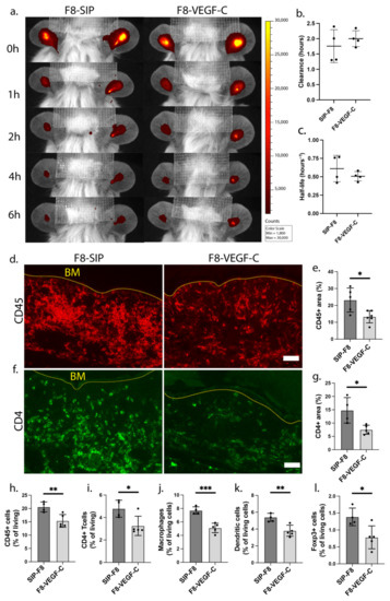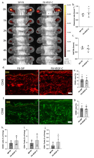 Next, we examined the immunological landscape and lymphatic drainage functionality of F8-SIP and F8-VEGF-C-treated K14-VEGF-A transgenic ear skin after the inflammation had resolved. First, we assessed the drainage capacity of the lymphatic vasculature in the ears in both groups by tracking the clearance of an intradermally injected, lymphatic-specific near-infrared tracer (P20D800) [17]. We determined the clearance rate and half-life of the injected tracer over the course of 6 h at 74 days post-challenge but found no significant difference (Figure 2a–c). By immunofluorescence, we also analyzed the distribution of immune cells in the ear skin. No significant changes in the density of CD45+ cells in F8-SIP or F8-VEGF-C-treated K14-VEGF-A transgenic mice were detected after 74 days (Figure 2d,e), and there were no significant changes in macrophage distribution, as defined by CD68 (Figure 2f,g), CD206, and F4/80 (Supplementary Figure S2a–c). Congruently, using flow cytometry of whole ears at day 74 in both treatment groups, we found no significant differences in CD45+ immune cell infiltration (Figure 2h, Supplementary Figure S2d) and CD4+ or CD8+ T cell numbers between ears of both treatment groups (Figure 2i,j, Supplementary Figure S2e), suggesting that the immunological status of the ear skin was comparable in both groups at this timepoint.