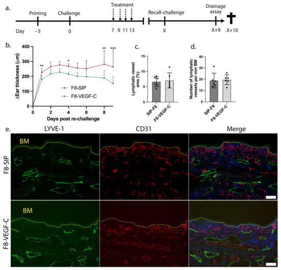 (a) Schematic representation of the long-term inflammation experimental setup with the treatment regimen on days 7, 9, 11, and 13 (dashed arrows). X indicates the day when the ear thickness of both treatment groups had returned to baseline, and therefore the day when inflammation was resolved. (b) Changes in ear thickness over 10 days after re-challenge in F8-SIP and F8-VEGF-C-treated K14-VEGF-A transgenic mice relative to ear thickness before re-challenge (n = 4–5 mice per group, 2-way ANOVA with Bonferroni post-test; one representative of two independent experiments shown). (c) Quantitative analysis of lymphatic vessel area as % of the region of interest at day 10 after re-challenge (expressed as a mean %, n = 6 mice per group, two-tailed Student’s t-test, one representative of two independent experiments shown). (d) Analysis of number of lymphatic vessels in previously F8-SIP and F8-VEGF-C-treated K14-VEGF-A transgenic mice on day 10 after re-challenge (expressed as mean number per mm basement membrane length, n = 6 mice per group, two-tailed Student’s t-test, one representative of two independent experiments shown). (e) Representative immunofluorescence images of ears from F8-SIP and F8-VEGF-C-treated K14-VEGF-A transgenic mice stained for Lyve-1 (green), CD31 (red), and Hoechst 33342 (blue) on day 10 after re-challenge. Dotted yellow line: basement membrane (BM). Size bars: 100 μm. All data are presented as mean ± SD. * p < 0.05, ** p < 0.01, *** p < 0.001.