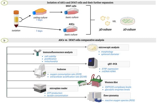 Overview of experimental steps. (a) Isolation of ASCs and DFAT cells and their further expansion (b) ASCs and DFAT cells comparative analysis.