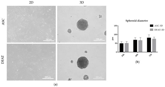 After being seeded on the anti-adhesive surface plates and after enriching their environment with bFGF and EGF, both ASCs and DFATs were able to spontaneously form three-dimensional spheroids floating in the culture medium (Figure 3a,b). The spheroids diameter was observed to increase from 49.0 µm ± 10.6 (ASC-3D) and 49.8 µm ± 10.7 (DFAT-3D) at 24 h of culture to 68.5 µm ± 13.7 (ASC-3D) and 66 µm ± 16.8 (DFAT-3D) after 48 h, and it finally reached maximal values of 80.4 µm ± 17.9 (ASCs-3D) and 74.7 µm ± 10.5 (DFATs-3D) diameters after 72 h in suspension (Figure 3b). After 96 h, a slow disintegration of both ASCs-3D and DFATs-3D populations was detected. The time of 72 h was considered the most optimal for the cell growth in spheroid cultures and it was chosen for further experiments. For the standard adhesive ASCs-2D and DFATs-2D cultures the 2nd passage was used in further experiments.