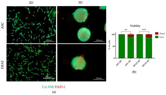 The comparative analysis of ASCs and DFATs viability revealed that the majority of cells in both culture types were alive. In the monolayers, live CalAM-positive cells reached 98.6% ± 0.3 in ASCs-2D and 98% ± 0.7 in DFATs-2D. In 3D cultures, the percentage of alive cells was 90.1% ± 3.6 in ASCs-3D and 88.4% ± 1 in DFATs-3D. More dead cells were present in 3D culture (Figure 4a,b).